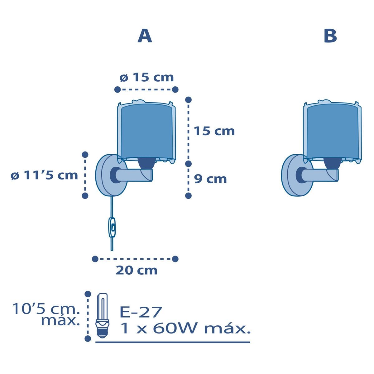 - Anslutningskabelns längd 150 cm; Ø väggfäste 11,5 cm; Ø skärm 15 cm