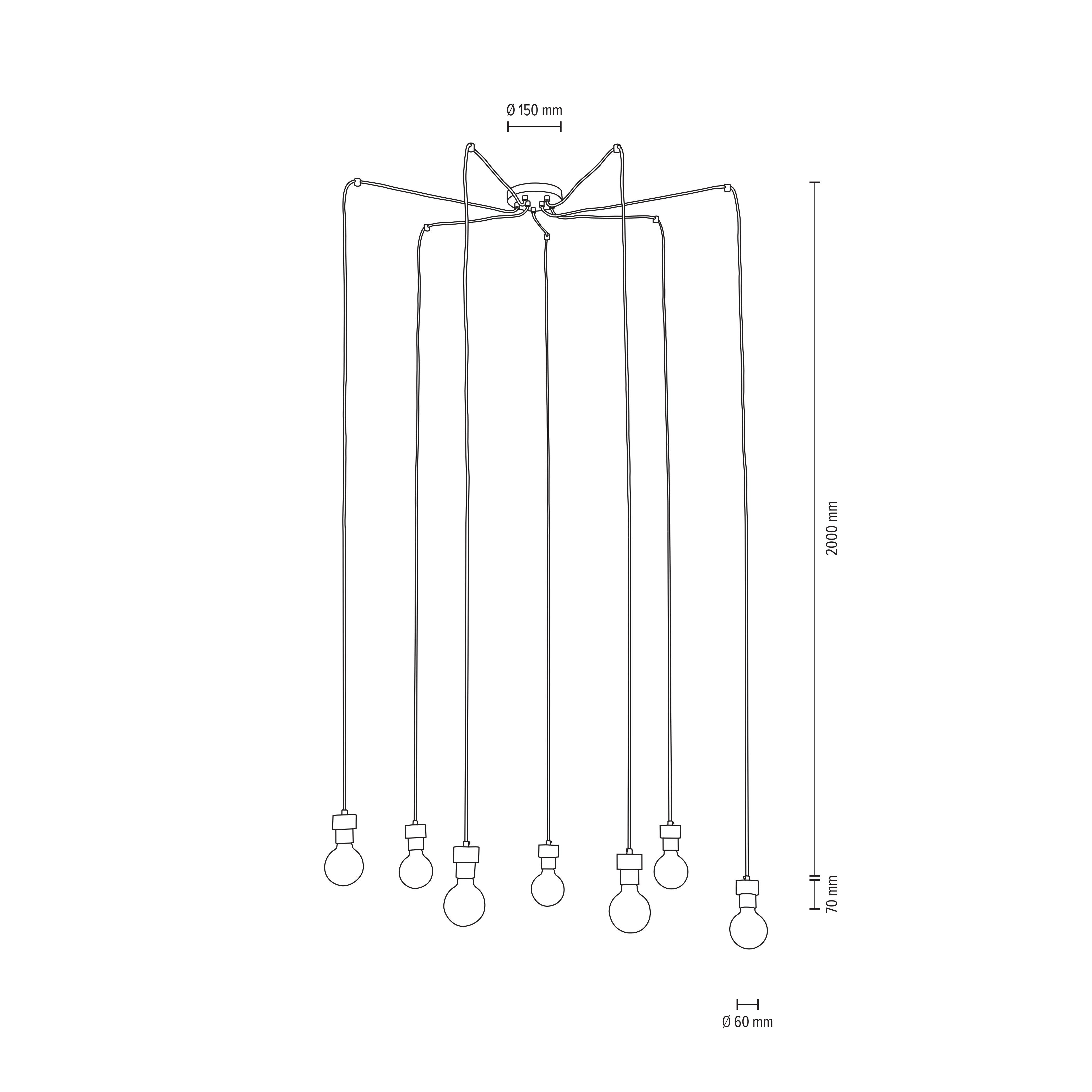 Sju lampors Merlo-pendel med decentraliserad upphängning och detaljer i ek Den svarta Merlo-pendeln är variabel, modern och har naturliga detaljer. Sju kablar kommer ut från en rund baldakin och är utrustade med fästen för decentraliserad fastsättning i taket. Det gör att pendlarna kan placeras individuellt. De senare har en rund form och är tillverkade av ljus oljad ek. Designen utan skärm ger en perfekt grund för dekorativa ljuskällor - Armatur av märket Envostar - Tillverkad i Europa - Hållbar förpackning tillverkad av återvinningsbara material