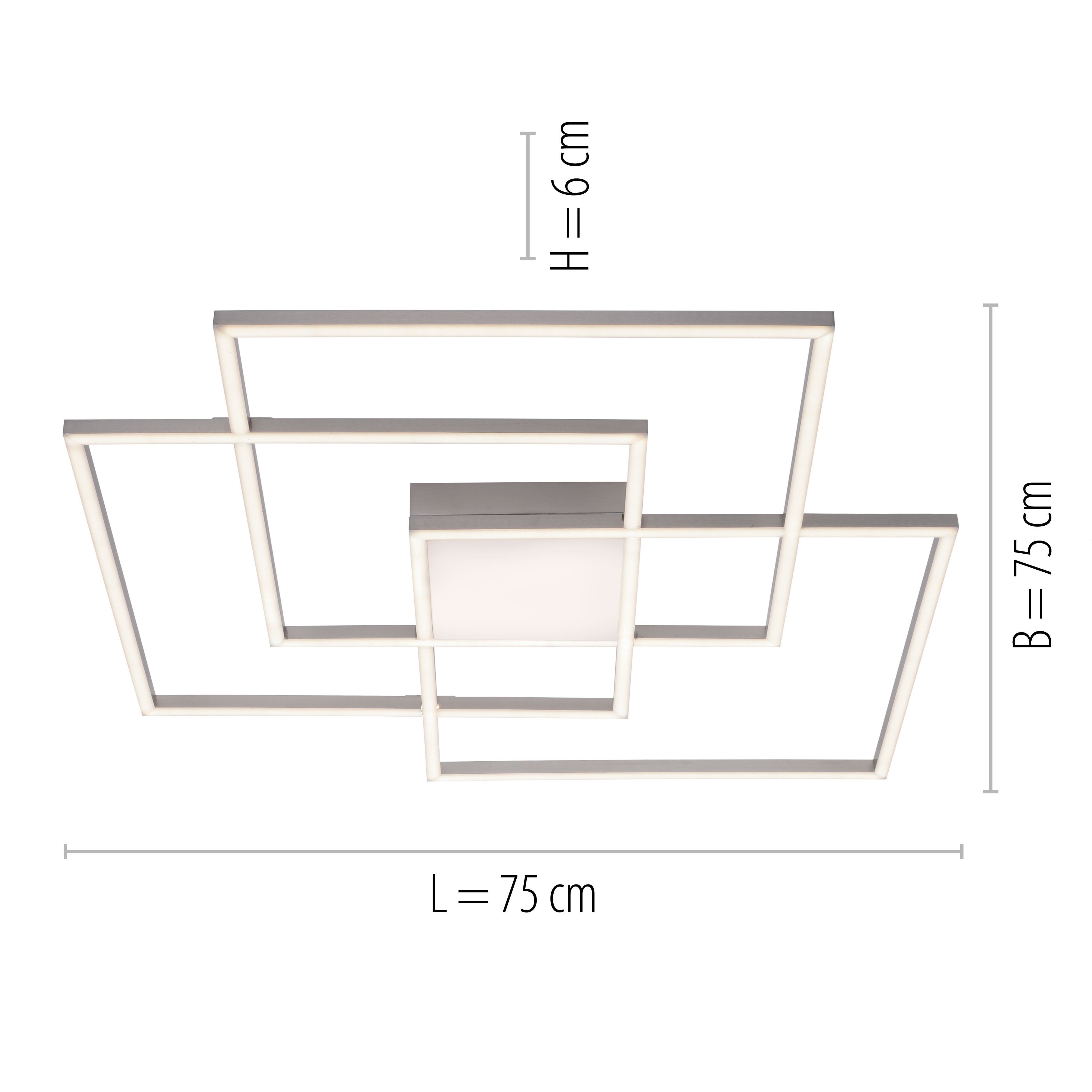 Den moderna LED-taklampan Asmin består av tre fyrkantiga ramar som är utrustade med dimbara LED-lampor. Med den medföljande fjärrkontrollen kan dessa även ändras i färgtemperatur från varmvit till universalvit. Tack vare seriekopplingen kan de enskilda områdena av armaturen också slås på separat, antingen alla lampor, bara de yttre eller bara de inre. Asmin är idealisk som takbelysning för alla bostadsutrymmen. Oavsett om det är i vardagsrummet eller sovrummet, med fjärrkontrollen styrs belysningen bekvämt.