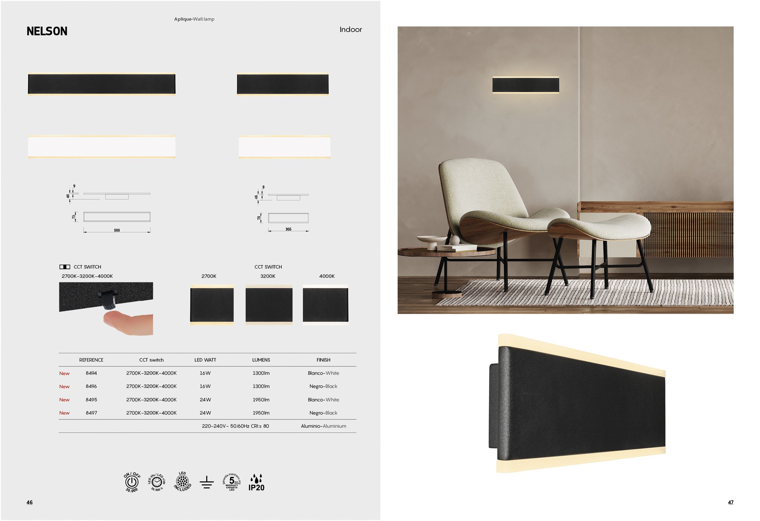 LED-vägglampan Nelson: CCT-funktion för atmosfär i vardagsrum och hallar LED-vägglampan Nelson med integrerad CCT-funktion öppnar upp för nya dimensioner inom rumsbelysning. Den innovativa CCT-funktionen gör det möjligt att justera färgtemperaturen individuellt med en strömbrytare på armaturen och på så sätt påverka atmosfären i vardagsrum och hallar. Den uppåtriktade och nedåtriktade belysningen skapar unika ljuseffekter på väggen. LED-vägglampan Nelson är tillverkad av högkvalitativ aluminium i rektangulär form och utrustad med satinerade diffusorer upptill och nedtill, och kombinerar hållbarhet med tidlös design och behagligt ljusflöde - Valbara färgtemperaturer: Varmvit (2.700 K), varmvit (3.200 K), universalvit (4.000 K)