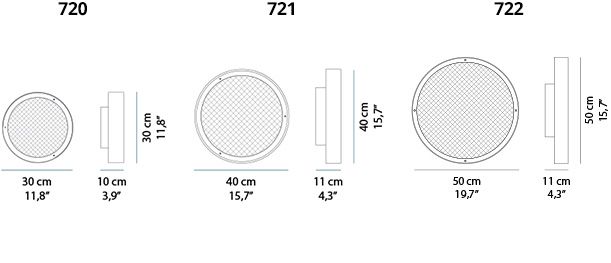 Den kombinerar runda former med en materialmix av metall och sandblästrat glas. En rund ring av metall med satinfinish i mässing håller en skiva av trådnätglas genom vilken ljuset från de två lamporna lyser. Detta skapar en direkt belysning som samtidigt filtreras genom glasdiffusorn.