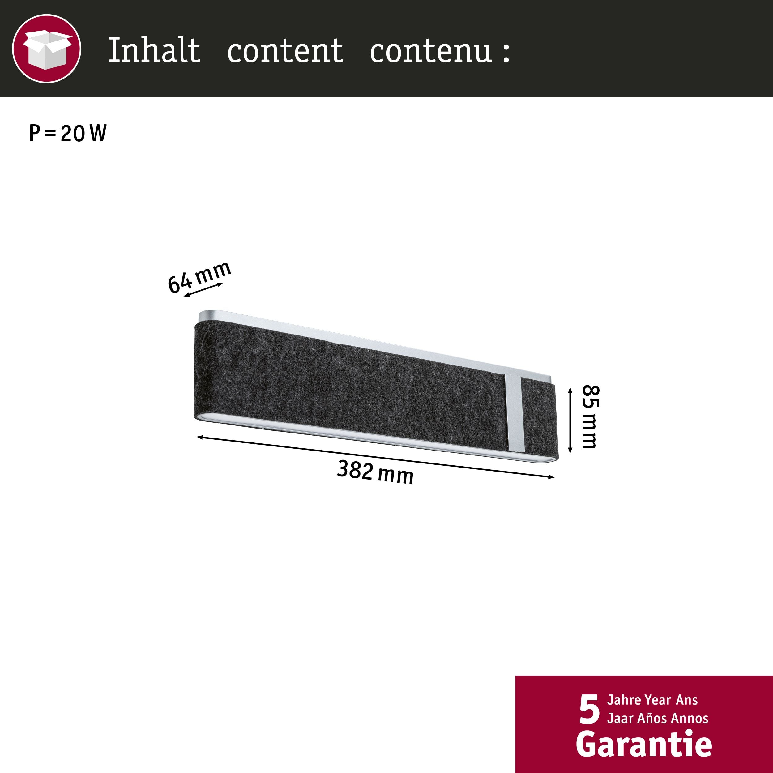 Bred LED-vägglampa Jagun med filtskärm i antracit och dimningsfunktion i 3 steg LED-vägglampan Jagun kombinerar modern design med funktionell ljusteknik. Den breda lampskärmen är täckt med metallelement och klädd i filt, som är tillverkad av minst 60 % återvunnet material. Det varmvita ljuset från LED-modulen sprids nedåt genom en satinerad kupa, vilket gör Jagun idealisk som orienteringsbelysning längs en korridor eller trappa. Med en vanlig väggbrytare kan ljuset dimras i tre steg (100 %, 50 %, 25 %) genom att Jagun kopplas in snabbt efter varandra. Den tidigare aktiva ljusstyrkan är tillgänglig igen när lampan tänds igen (minnesfunktion). Filtmaterialet har en ljuddämpande effekt och bidrar därmed till en gynnsam rumsakustik.