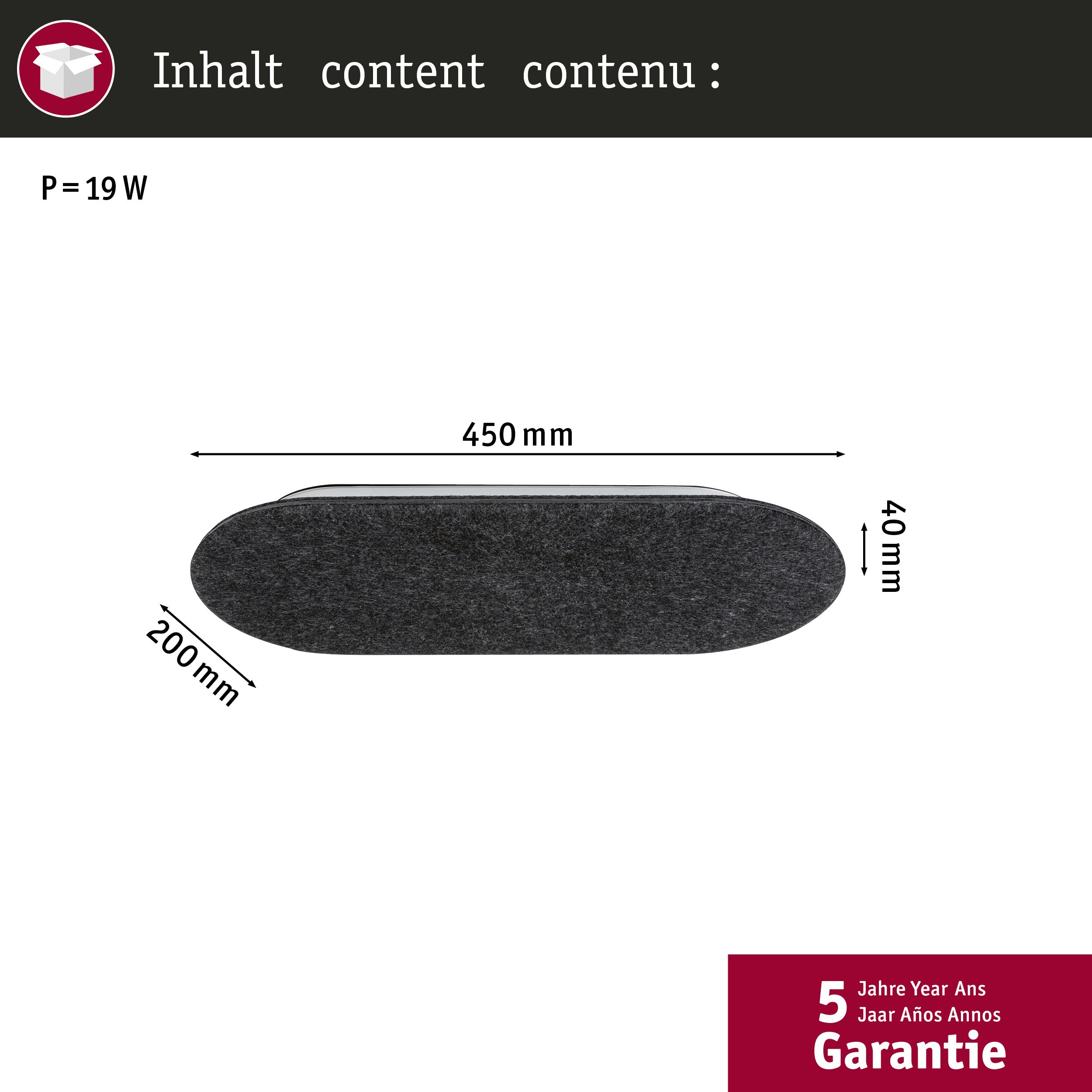 Oval Tulga LED-vägglampa med skärm av antracitfärgad filt och dimningsfunktion i 3 steg, indirekt ljusfördelning LED-vägglampan Tulga kombinerar modern design med funktionell ljusteknik. Den platta, ovala lampskärmen är tillverkad av antracitfärgad filt, som består av minst 60 % återvunnet material. Den varmvita LED-modulen är placerad på baksidan så att ljuset avges indirekt och avskärmas från framsidan. Med en vanlig väggströmbrytare kan ljuset dimmas i tre steg (100 %, 50 %, 25 %) genom att snabbt efter varandra slå på Tulga. Den tidigare aktiva ljusstyrkan är tillgänglig igen när lampan tänds igen (minnesfunktion). Filtmaterialet har en ljuddämpande effekt och bidrar därmed till en gynnsam rumsakustik.